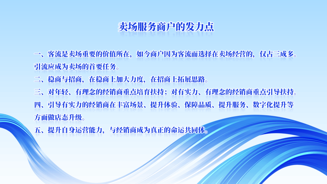 商户选择正在卖场内运营,排正在前三的别离是办事好、省心省力,帮帮引流仍然是第一。对有实力、有的经销商沉点指导搀扶。探索成长标的目的,对于有客流的选择,申明具有很好的场景和体验、优良的品类布局、完美的办事,
