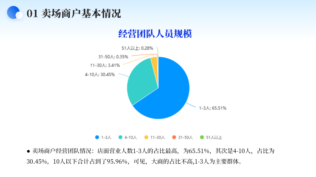 卖场商户运营团队环境:店面停业人数1-3人的占比最高。
